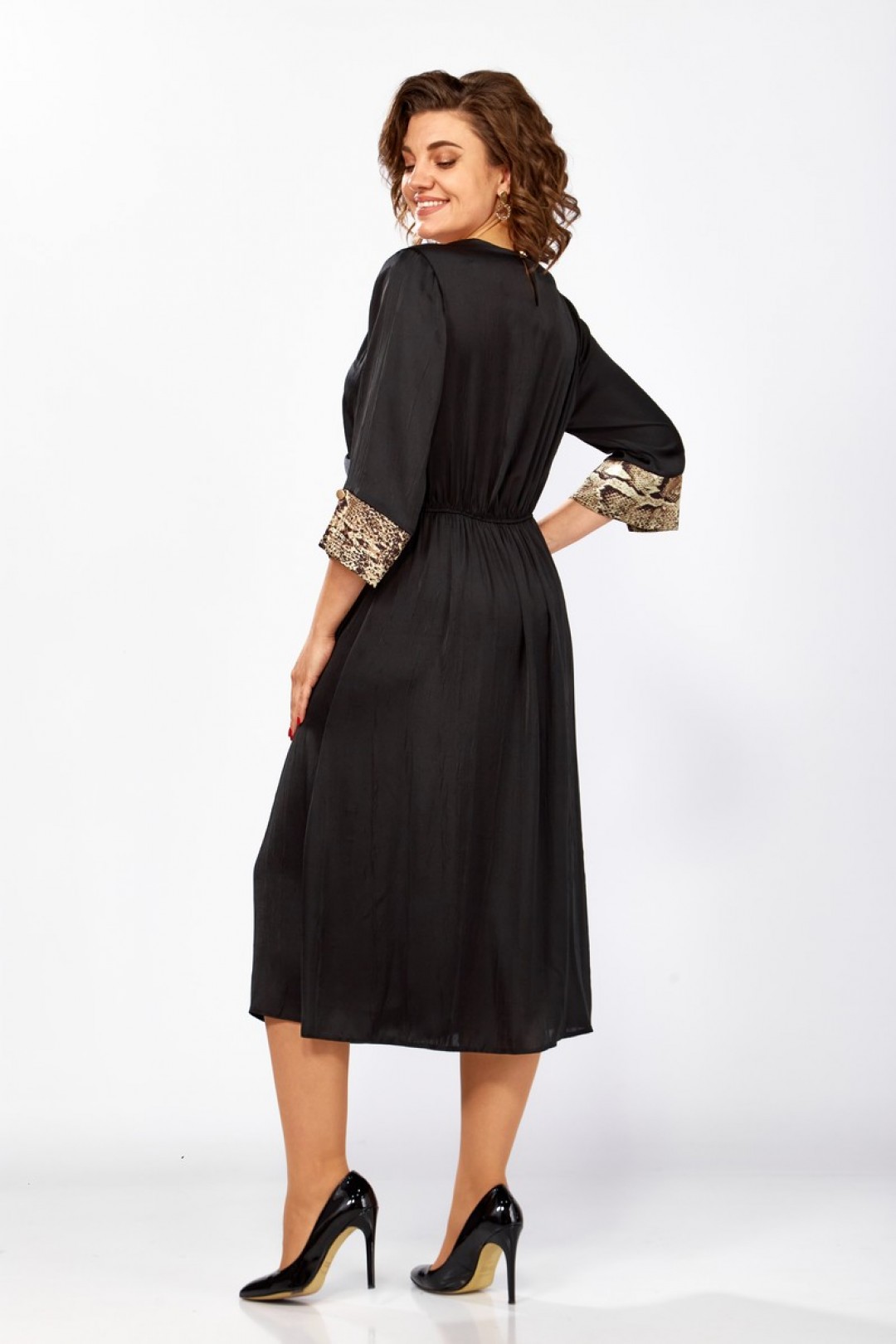 Женское платье, полу-прилегающего силуэта, выполнено из легкой текстильной ткани, отделка из сетки с пайетками. Горловина округлой формы, на обтачке, по линии талии отрезное. Лиф с драпировкой по линии талии, по горловине декоративная обтачка из сетки с пайетками и бусинами. Юбка платья расклешенного силуэта, из основной ткани. Спинка также отрезная по линии талии, с резинкой, рукав втачной, оптимальной длины, по низу на манжете из сетки с пайетками. Эффектное платье на любой случай жизни!