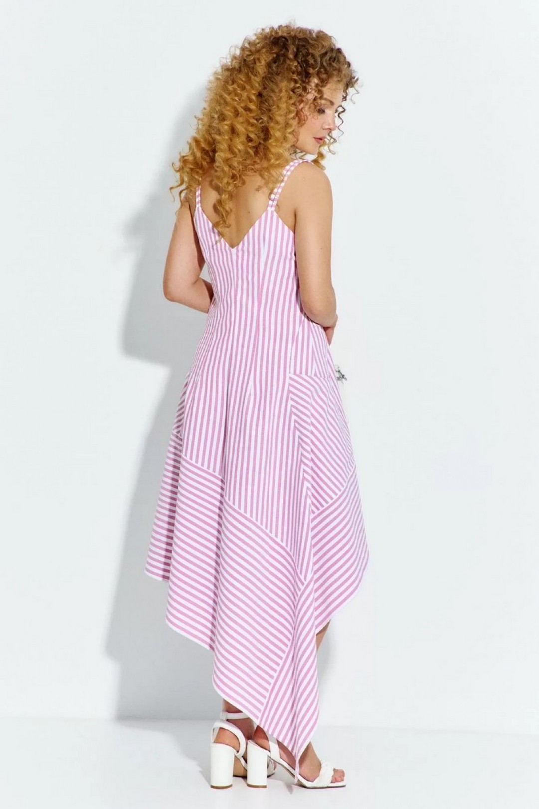 Платье женское свободного ассиметричного кроя, трапециобразного силуэта. Изделие с V-образным верезом горловины, на тонких лямках. По полочке изделия расположены нагрудные выточки и ассиметричный карман Низ изделия ассиметричный, фигурный с глубоким вырезом.