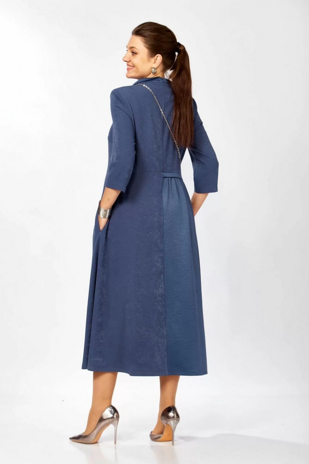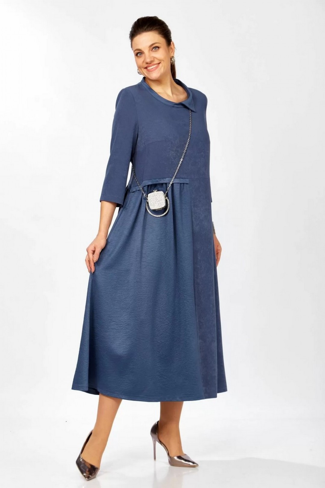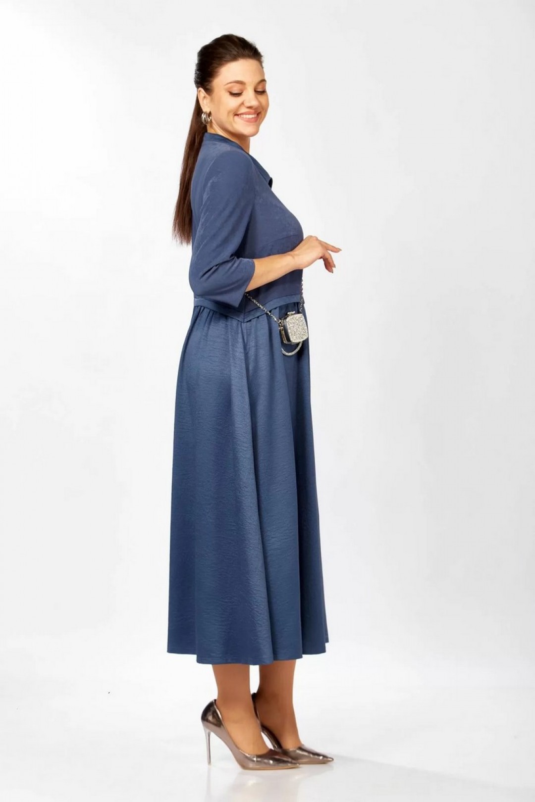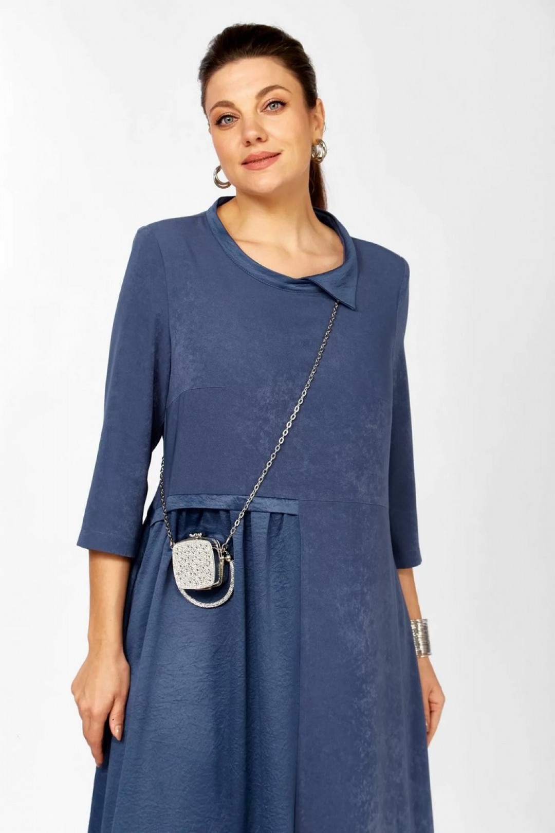 Нарядное платье полуприлегающего силуэта в иысканном дымчато-голубом оттене, отрезное по линии талии с обтачными планками. Полочки с нагрудными вытачками, которые выходят из бокового шва. Нижняя часть платья А-силуэта с одной стороны по линии талии с образованием мягких складок. Особенно выиграшно оно смотрится на фигуре, где надо прикрыть живот и бедра. Рукав втачной одношовный, длиной ¾. Вырез горловины округлой формы со стойкой и фантазийным воротником. Пошито платье из двух видов плательной ткани-бархатистой и шелковистой структуры.