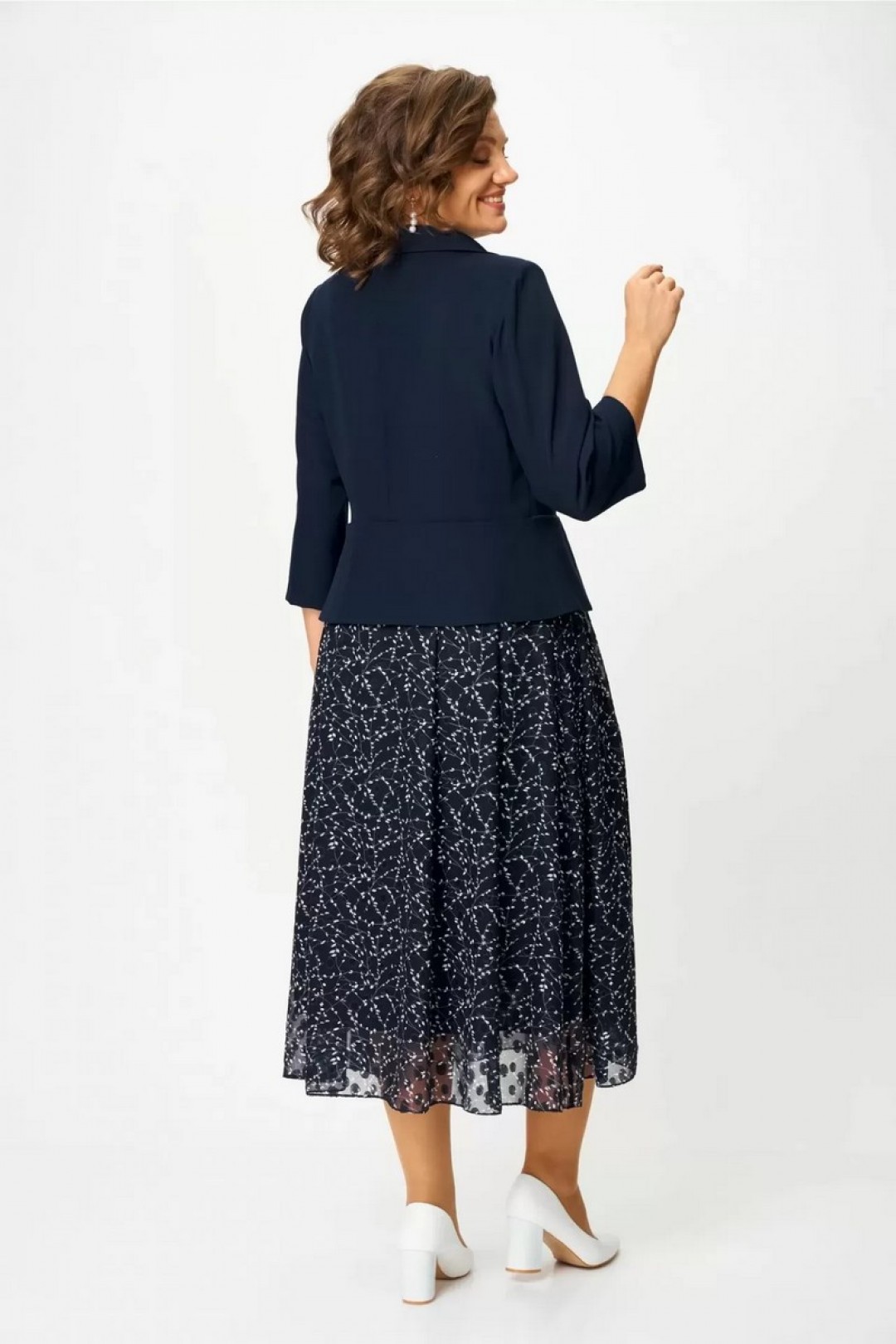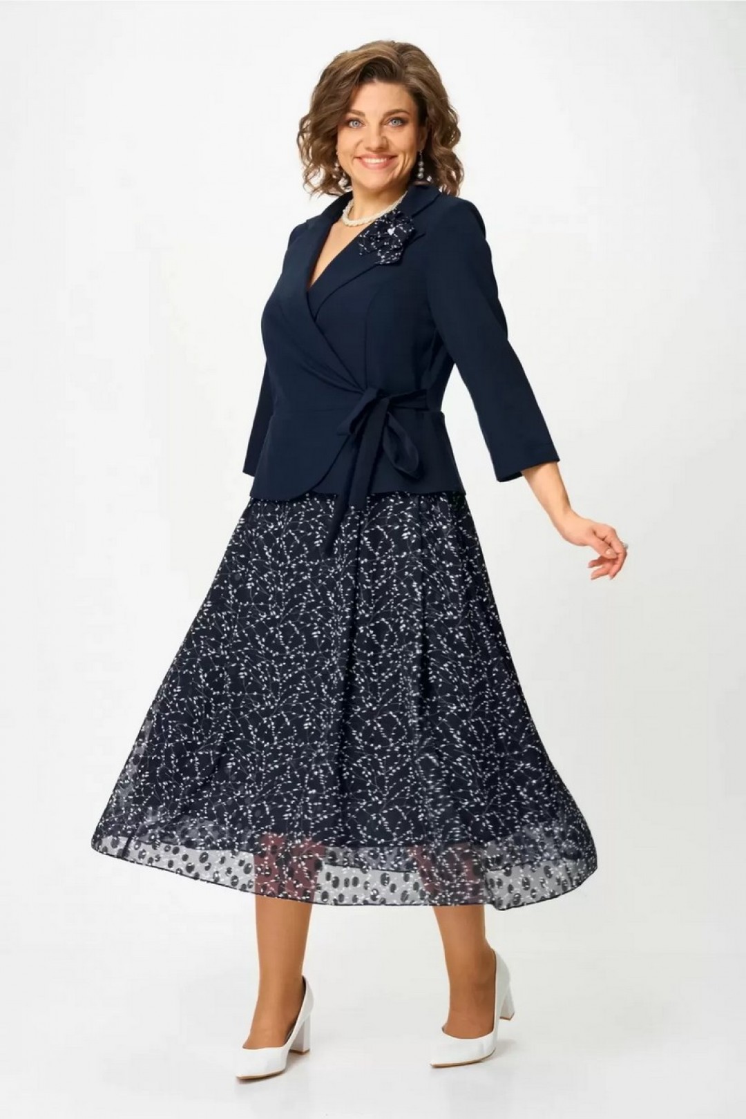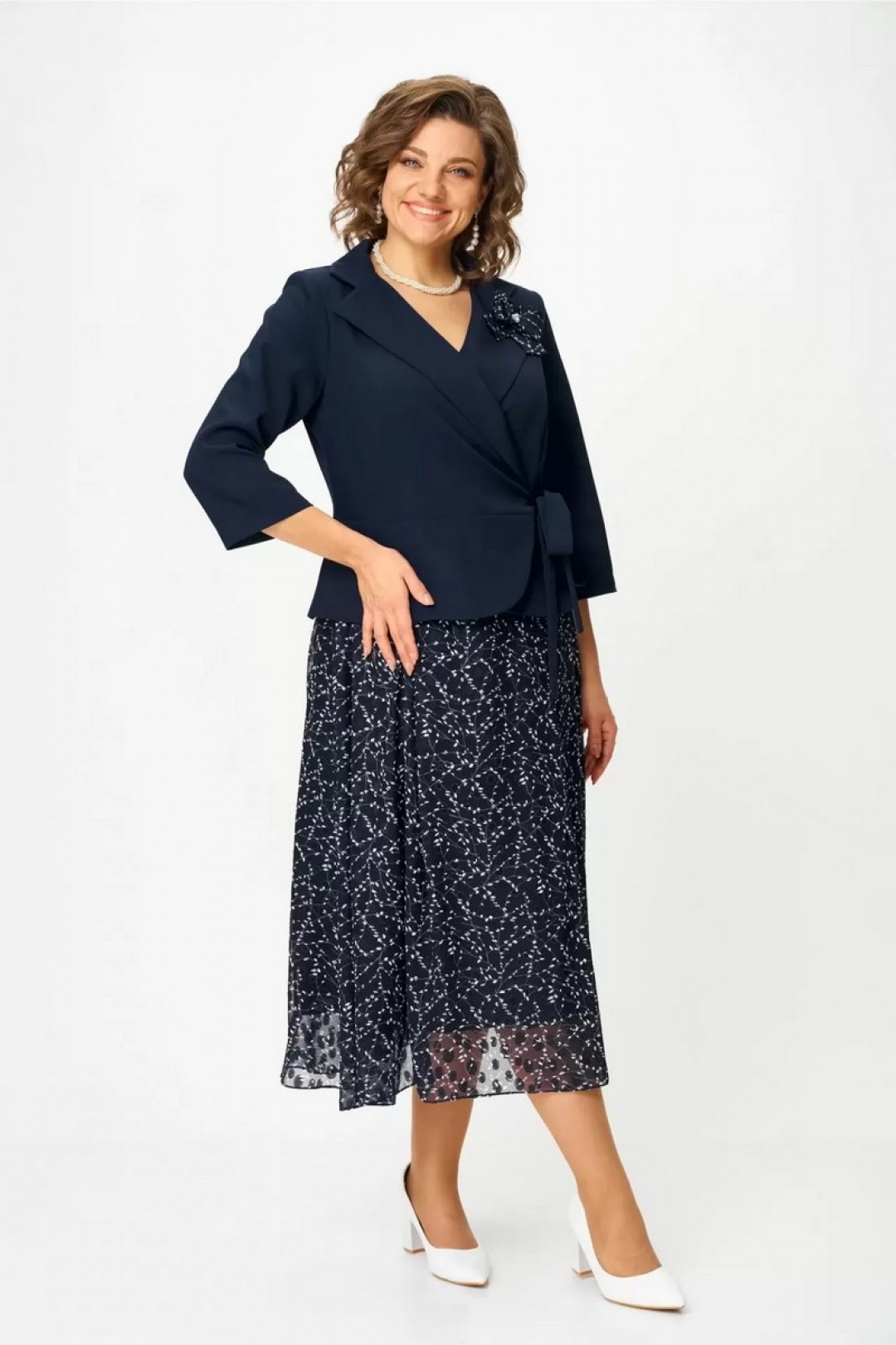 Элегантное женское платье, выполнено в виде имитации костюма из двух видов ткани. Лиф из плательной ткани, юбка из шифона. Платье с запахом, горловина с воротником пиджачного типа с отложными лацканами. Рукава втачные, длина 3/4. Юбка со складками по линии талии, расширенная к низу, на подкладке. По линии талии вставлен завязывающийся пояс.