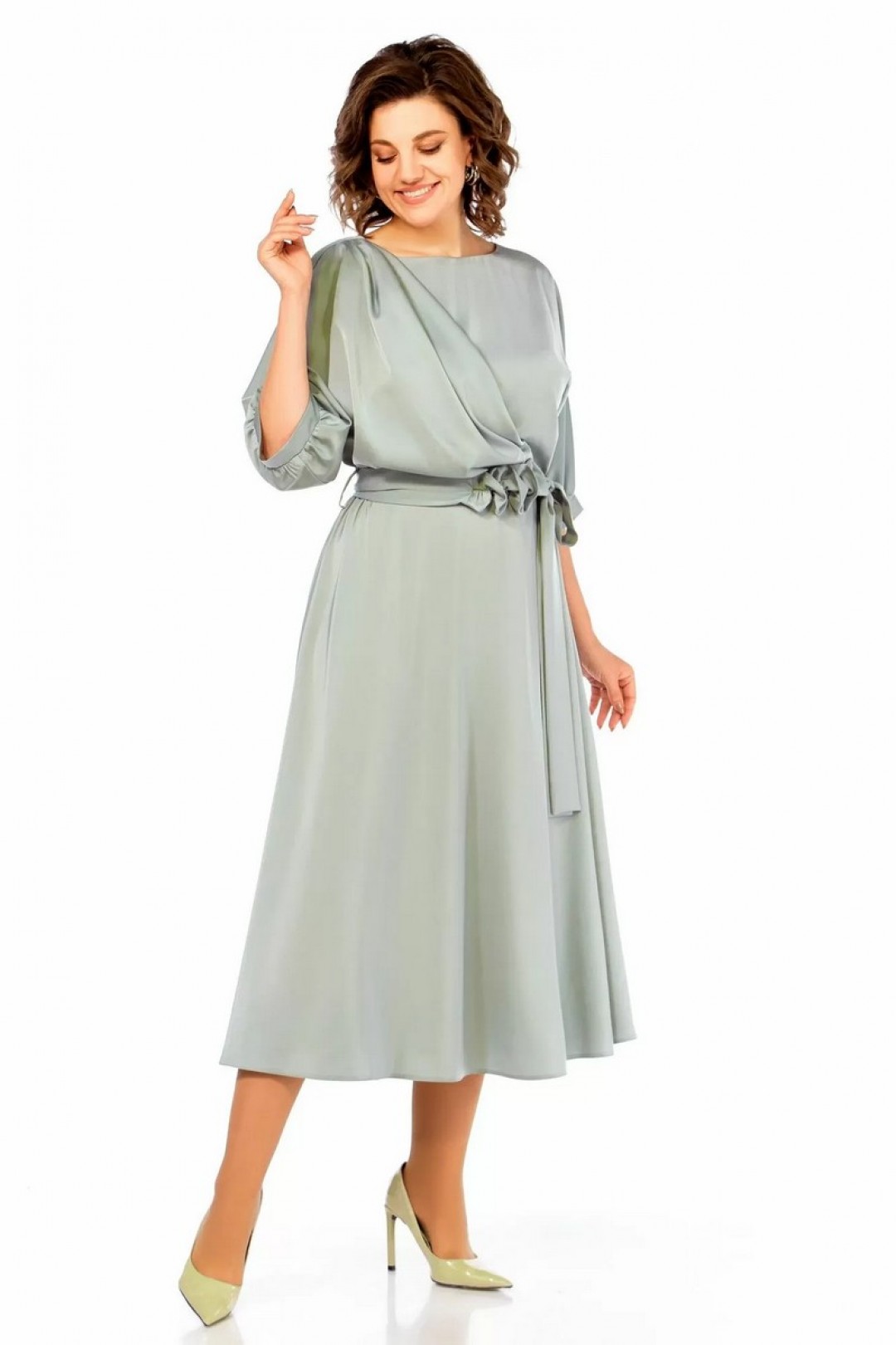 Нарядное платье из струящейся ткани, отрезное по линии талии. Верх летучая мышь, по низу рукава сборка и притачная манжета. Вырез горловины округлой формы. По переду ассиметричная деталь от плеча до линии подреза. По линии подреза резинка. Нижняя часть платья клеш. К платью прилагается интересный пояс, украшенный стразами.