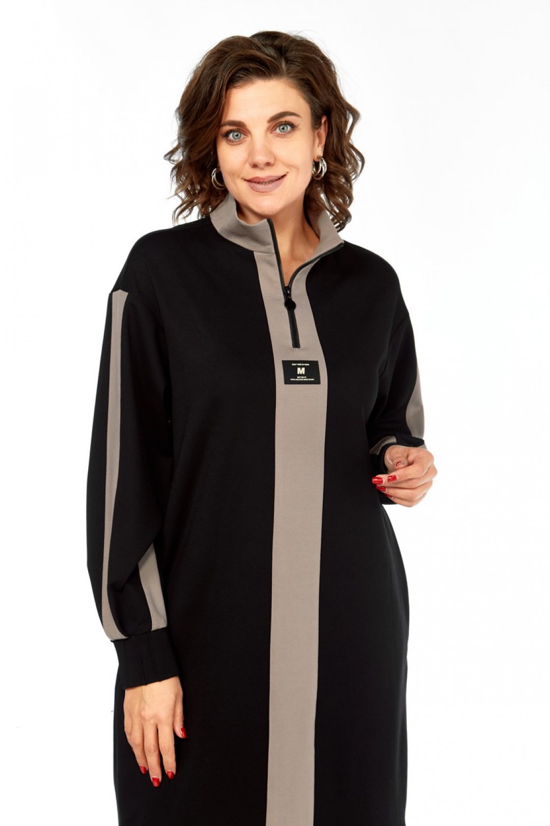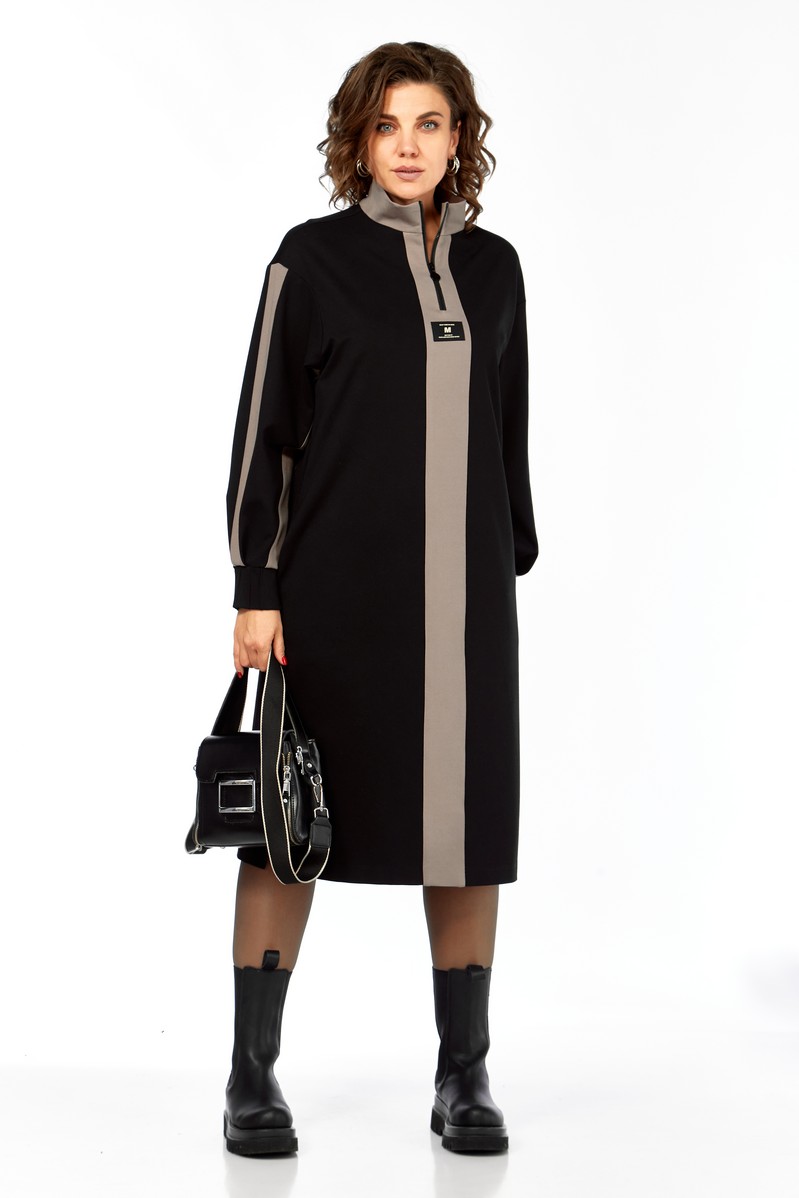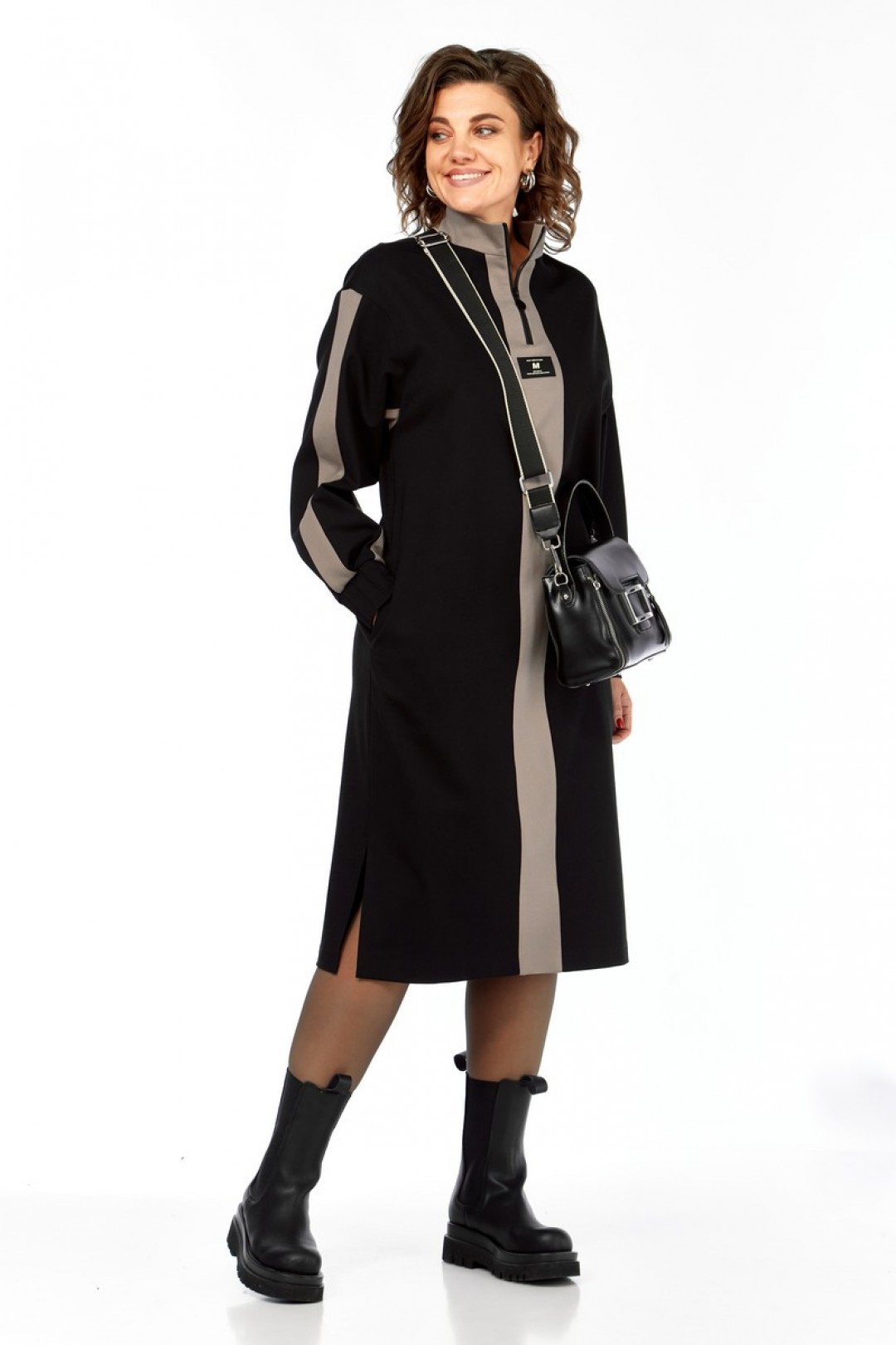 Платье в стиле спорт-шик прямого силуэта, с воротником-стойкой. По переду, по центру контрастная отделка, молния, переходящая в воротник, декоративная нашивка. В боковых швах карманы и разрезы в низу. Рукав опущенный на манжете, с контрастными полосками.