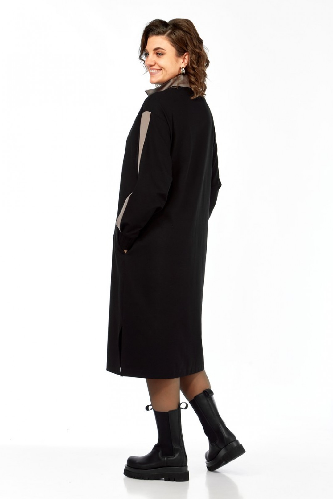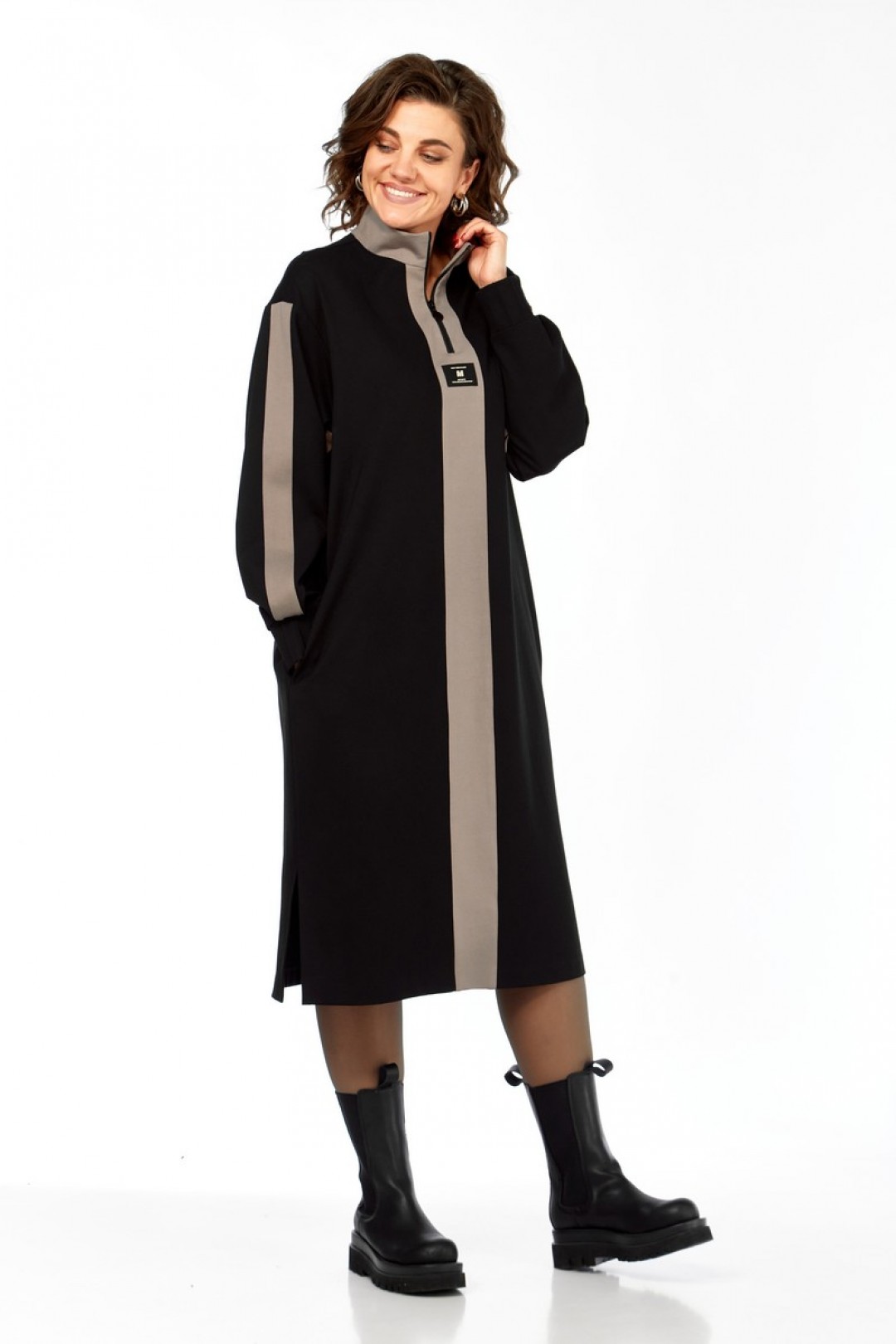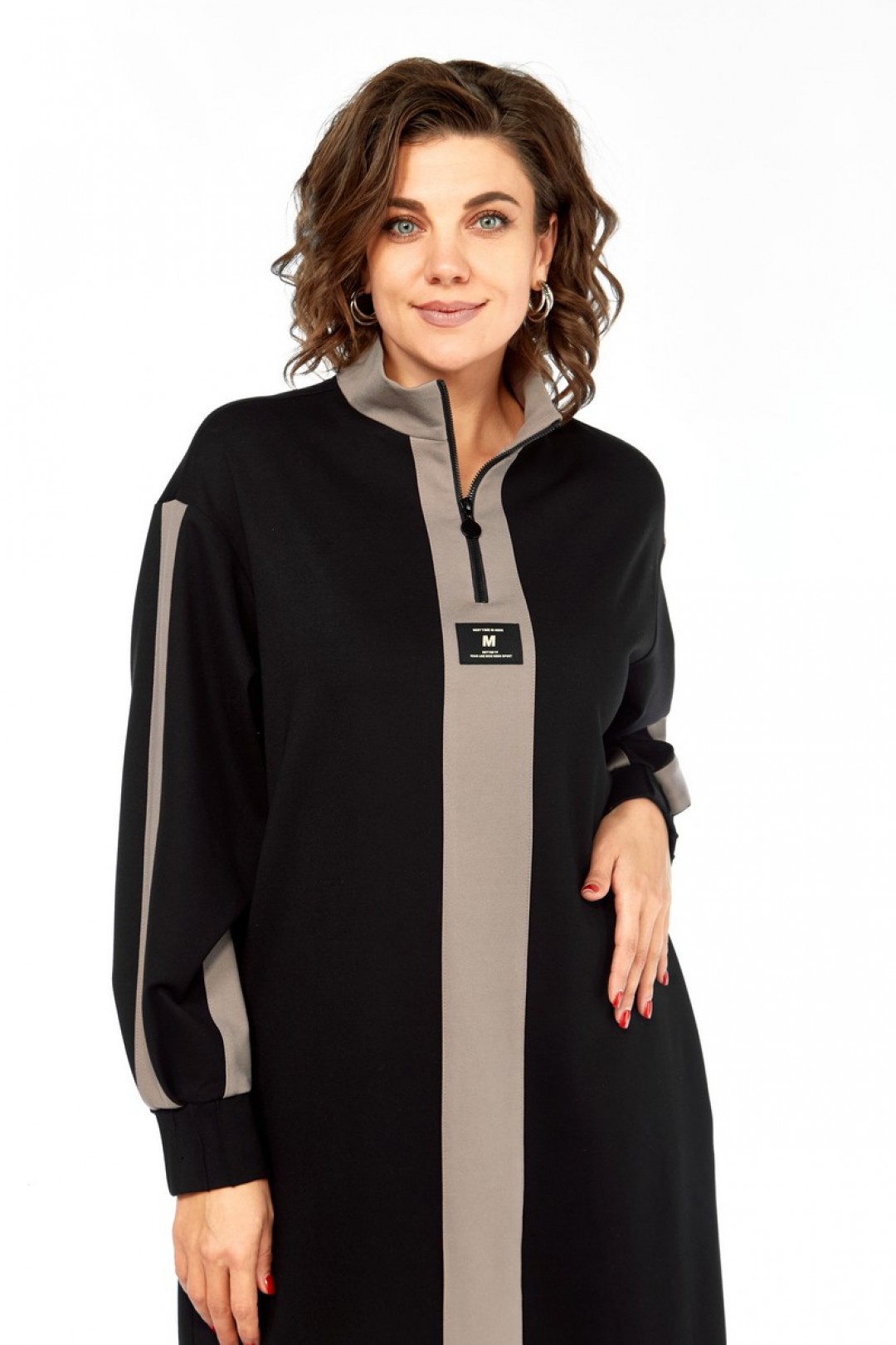 Платье в стиле спорт-шик прямого силуэта, с воротником-стойкой. По переду, по центру контрастная отделка, молния, переходящая в воротник, декоративная нашивка. В боковых швах карманы и разрезы в низу. Рукав опущенный на манжете, с контрастными полосками.