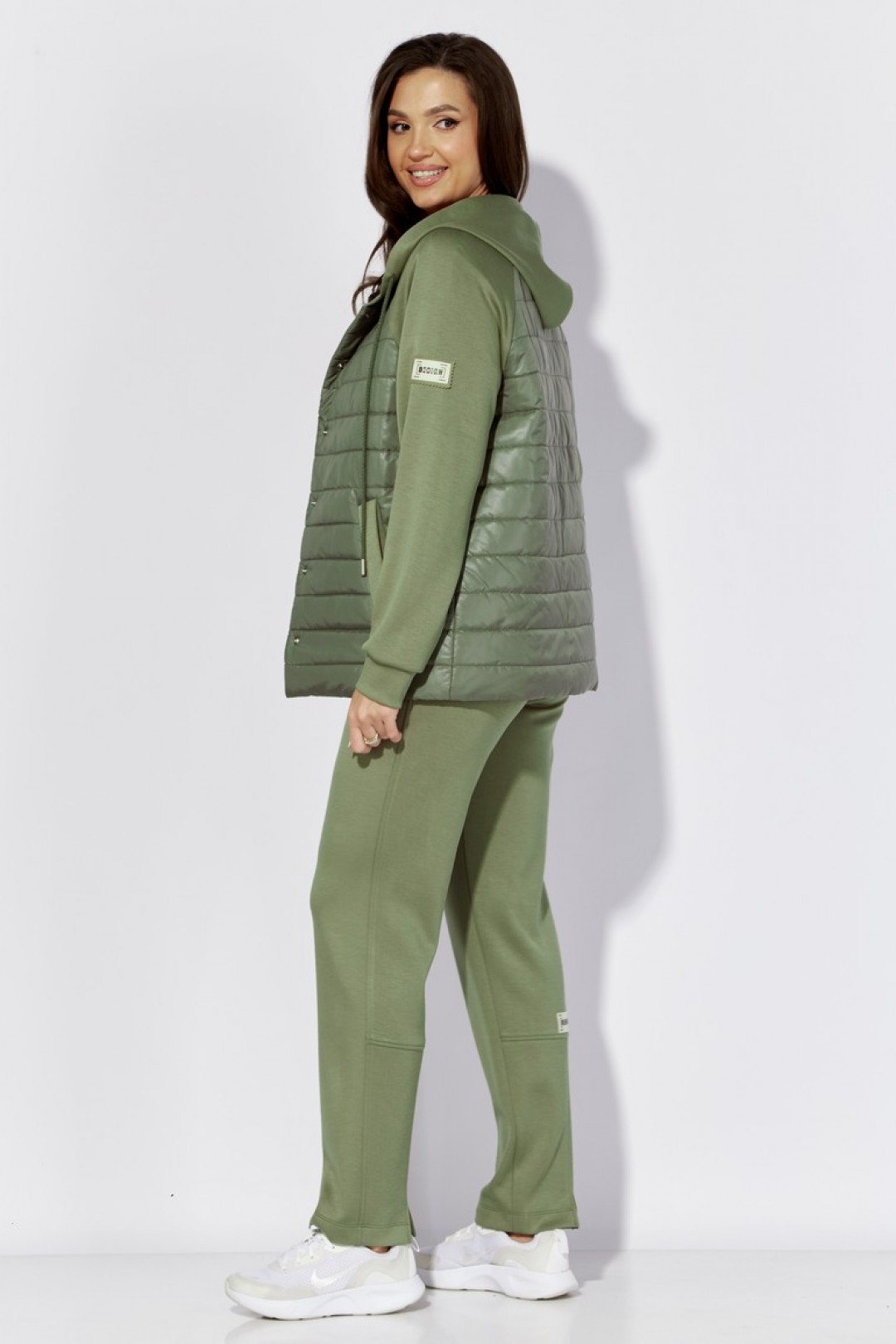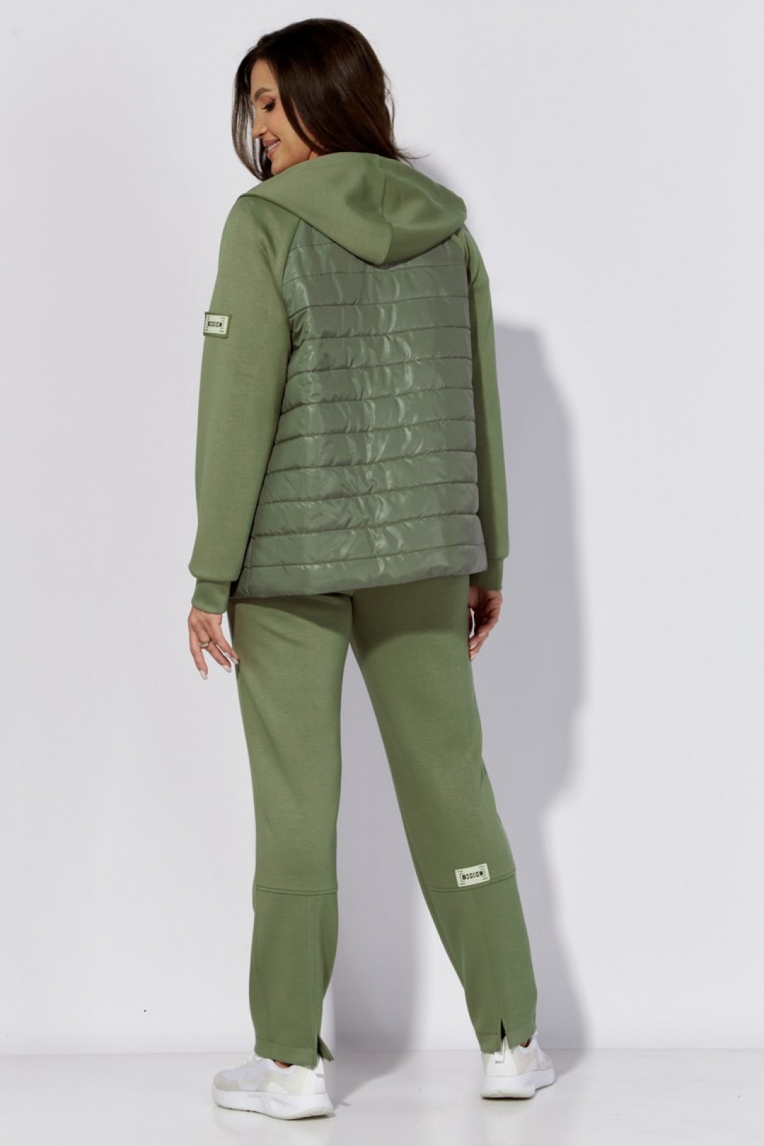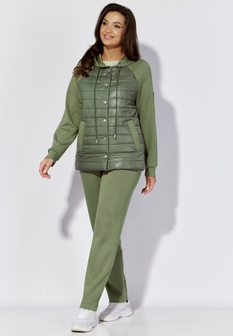 Куртка прямого силуэта, с длинным рукавом. , покроя "реглан" По низу рукава притачная манжета. Перед и спинка выполнены из плащевки, стеганой на синтепоне, на подкладке. Спереди карманы и центральная застежка на кнопки. Горловина оформлена капюшоном с кулисой по краю. На рукаве отделочная нашивка. Брюки прямые, с карманами в боковых швах. Сзади, снизу небольшие разрезы в подрезной детали и отделочная нашивка. Пояс притачной, с резинкой по кругу.