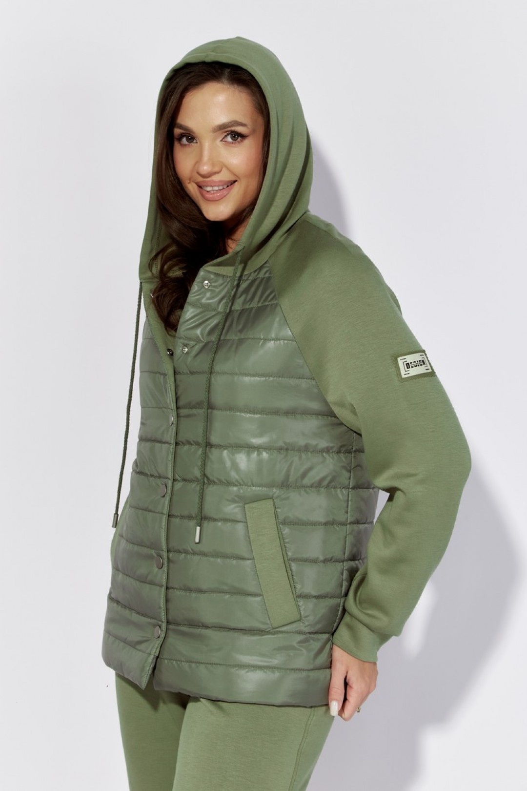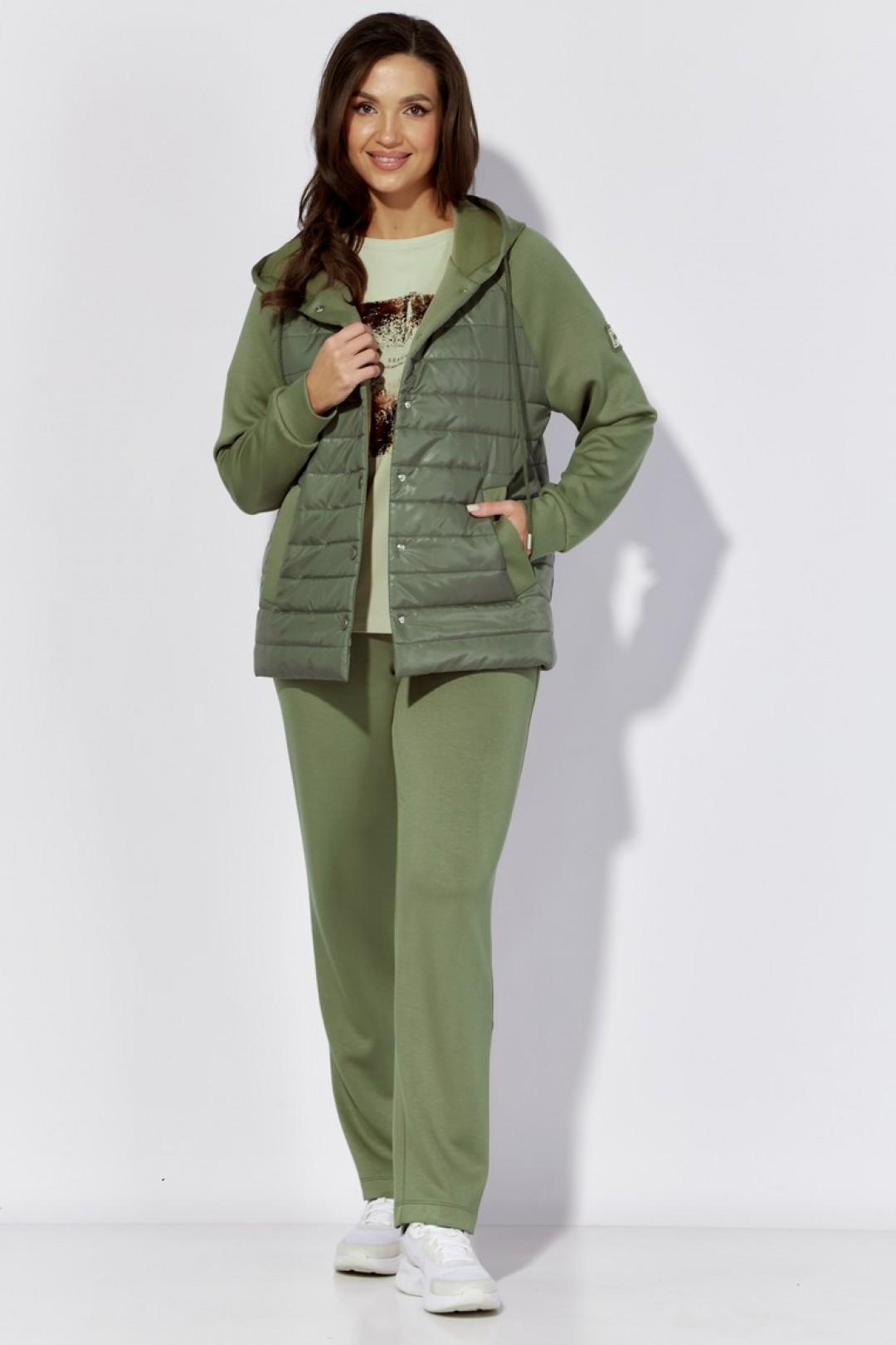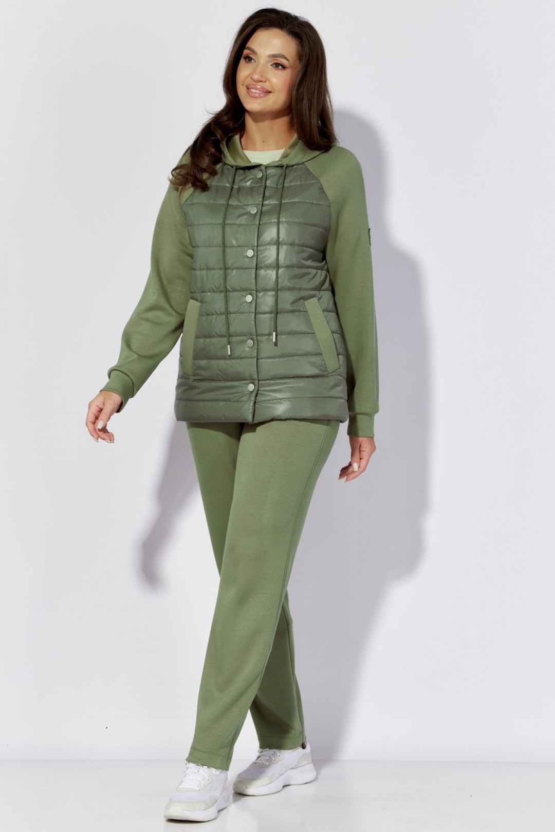Куртка прямого силуэта, с длинным рукавом. , покроя "реглан" По низу рукава притачная манжета. Перед и спинка выполнены из плащевки, стеганой на синтепоне, на подкладке. Спереди карманы и центральная застежка на кнопки. Горловина оформлена капюшоном с кулисой по краю. На рукаве отделочная нашивка. Брюки прямые, с карманами в боковых швах. Сзади, снизу небольшие разрезы в подрезной детали и отделочная нашивка. Пояс притачной, с резинкой по кругу.