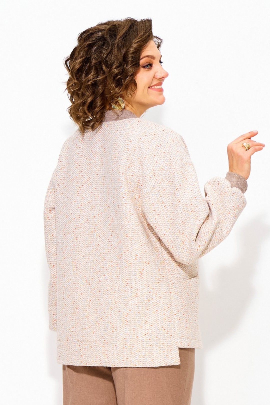 Женский твидовый жакет, по типу бомбера – стильная женская одежда на каждый день, которая станет отличным дополнением повседневного гардероба. Модель свободного силуэта, со спущенной линией плеча. Рукав длинный, с притачными манжетами по низу. Застежка центральная, на металлическую тесьму-молнию. Горловина обработана трикотажной планкой по типу – бомбера. Низ по полочке фигурный, по спинке удлинен. По полочке расположены рабочие карманы в шве! Свободная оверсайз модель подходит практически под любую фигуру. Модель на шёлковой подкладке!