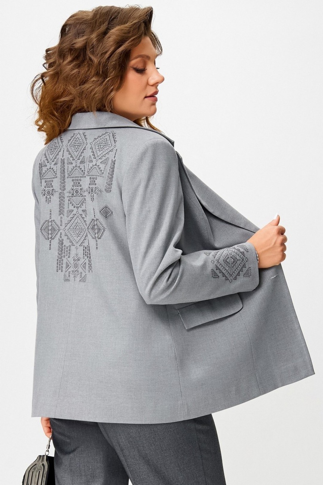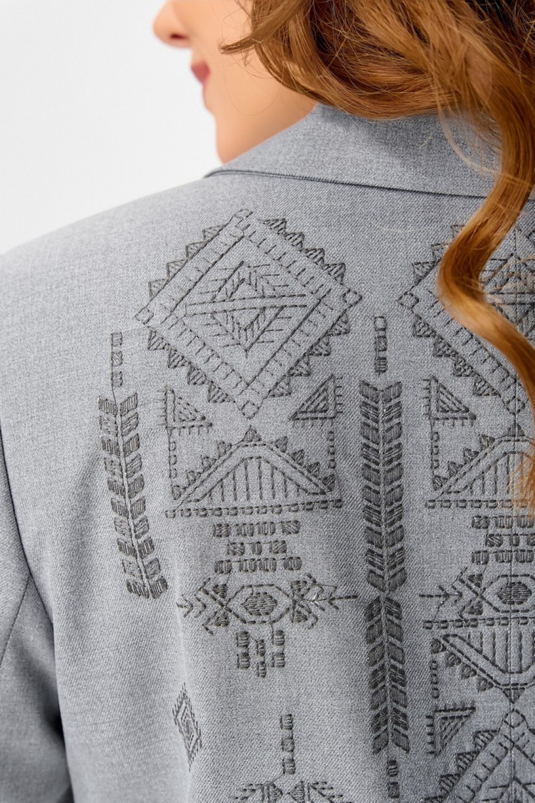 Вышивка — душа жакета Но истинная магия раскрывается в вышивке. На спинке и по низу рукавов — тонкая роспись нитями, как дыхание художника, оставившего свой след на холсте ткани. Эти узоры — не просто украшение, а визуальная поэма, придающая изделию индивидуальность, культурную глубину и эмоциональный резонанс.
