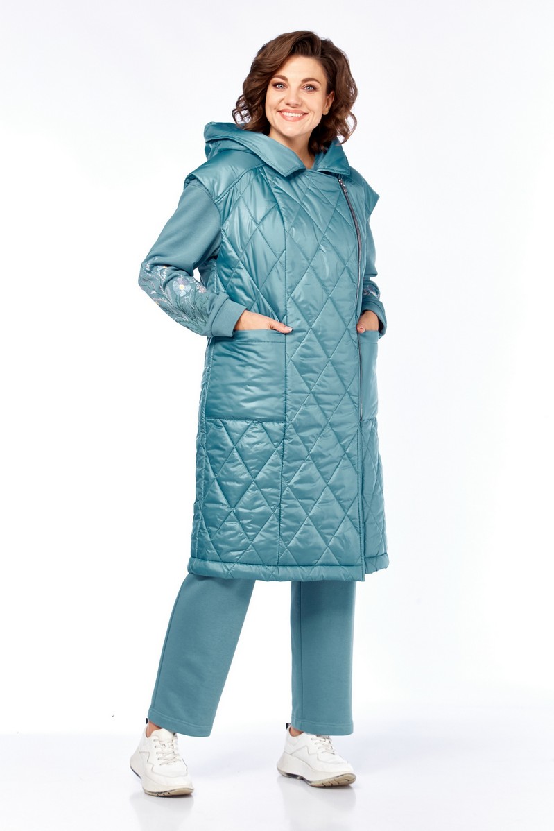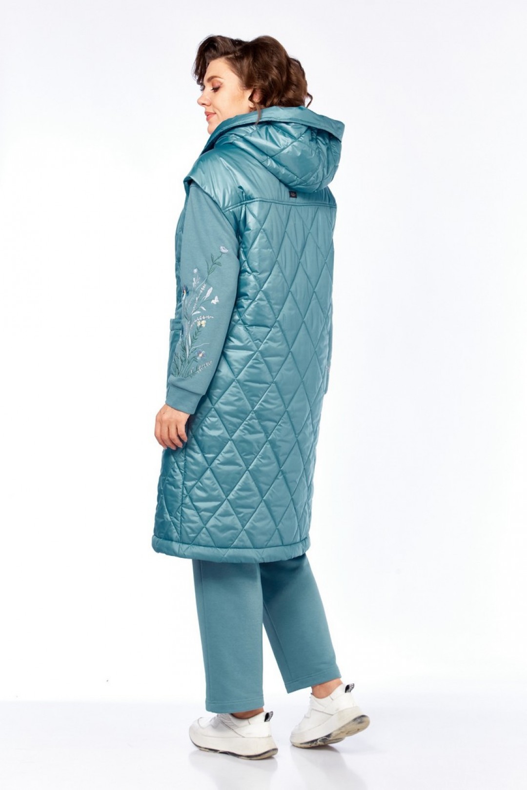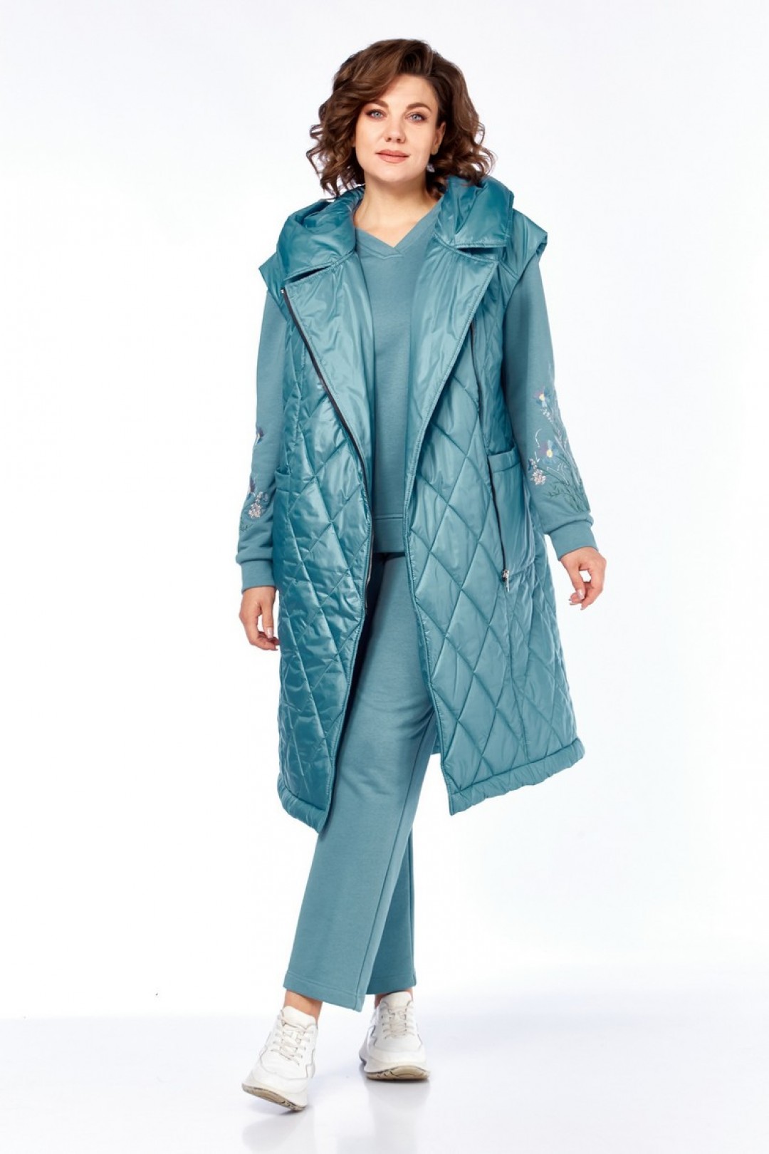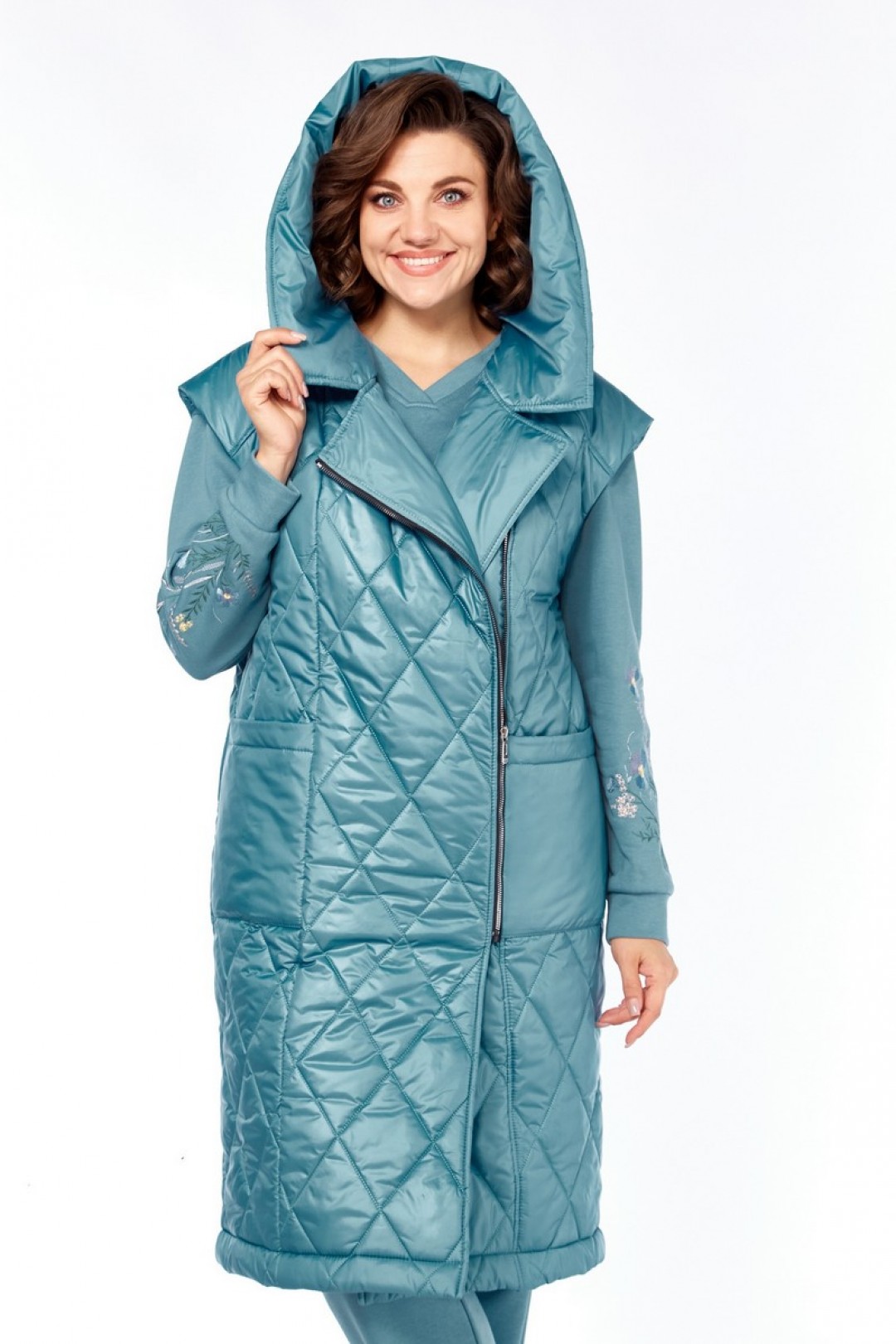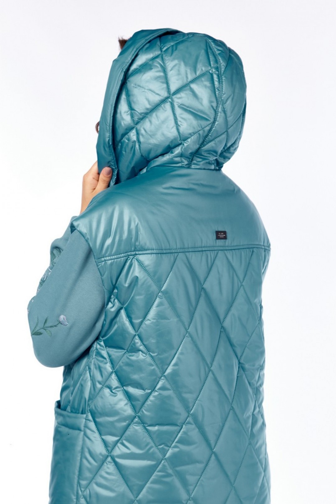 Жилет удлинённый со смещенной застёжкой на тесьму-молнию под "металл ". Перед с кокетками, переходящими на спинку,рельефами от них до низа и накладными карманами. Спинка цельная. Горловина обработана капюшоном.